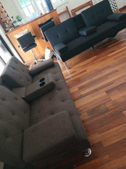 SOFA CAMA CON PORTA VASOS, NEGRO, MARRÓN Y GRIS